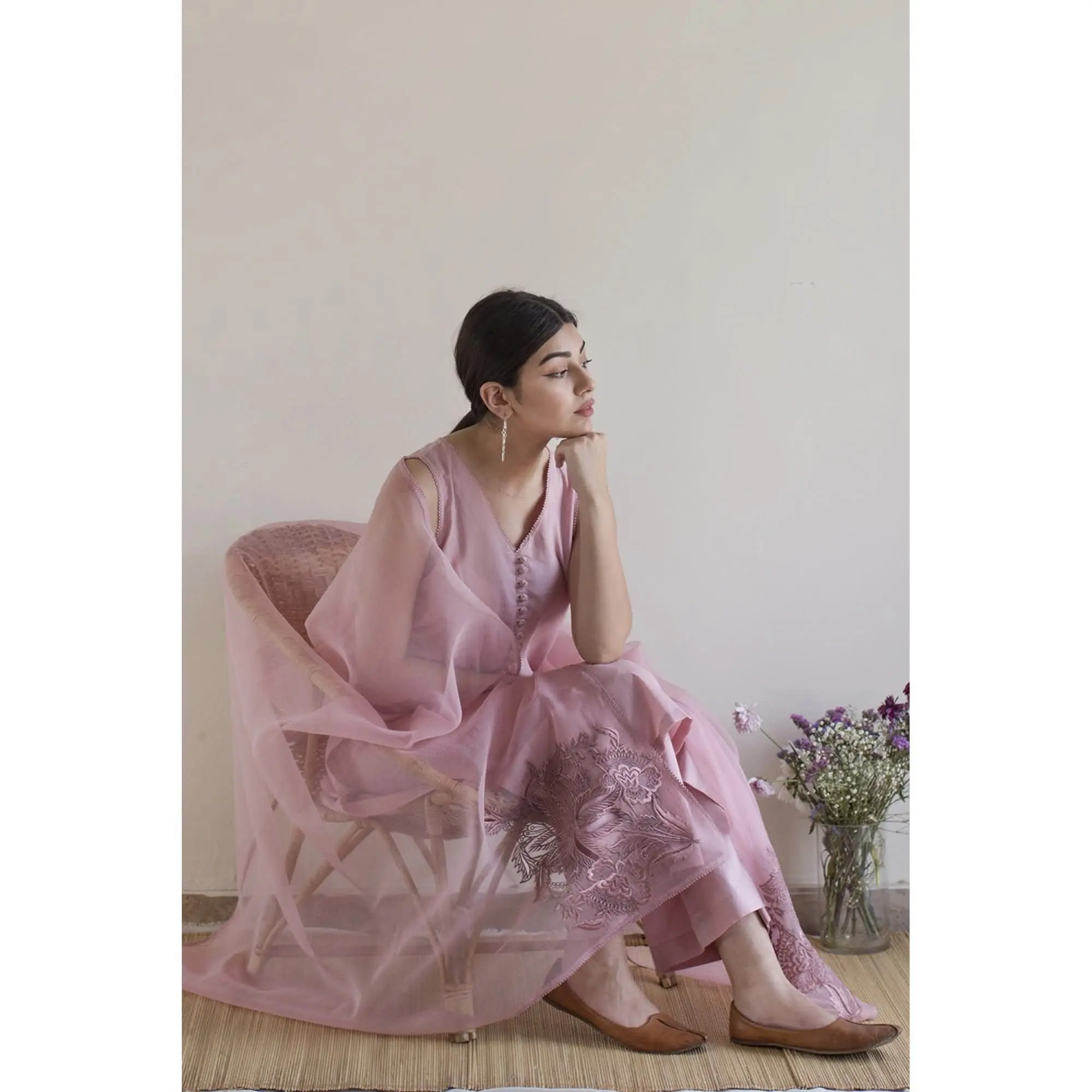 Paired with a lightweight, sheer organza dupatta featuring delicate embroidery that adds a touch of sophistication and elegance to your overall look.