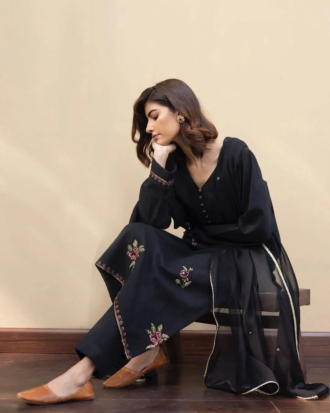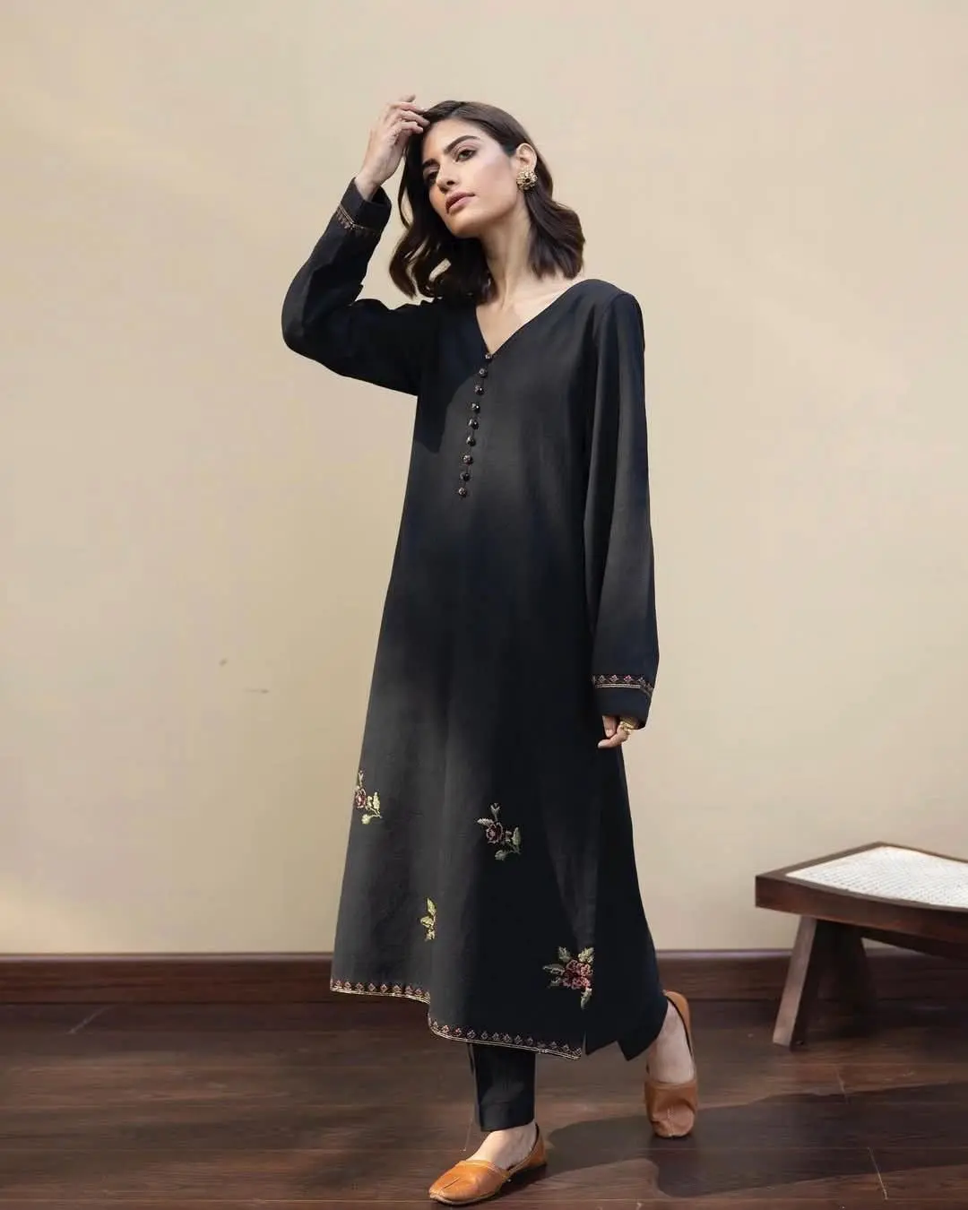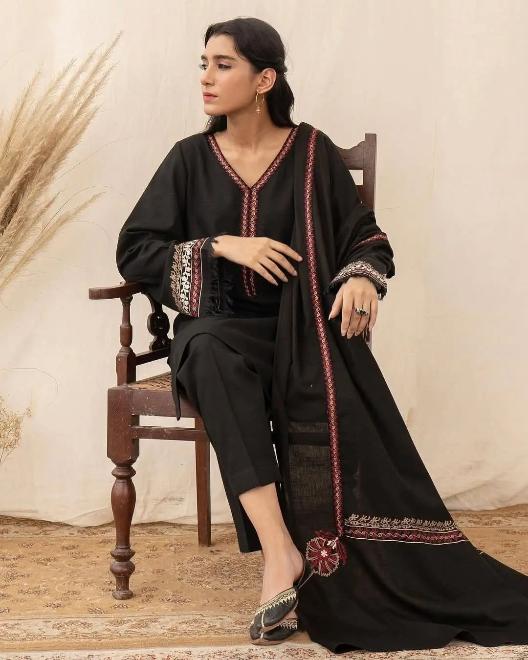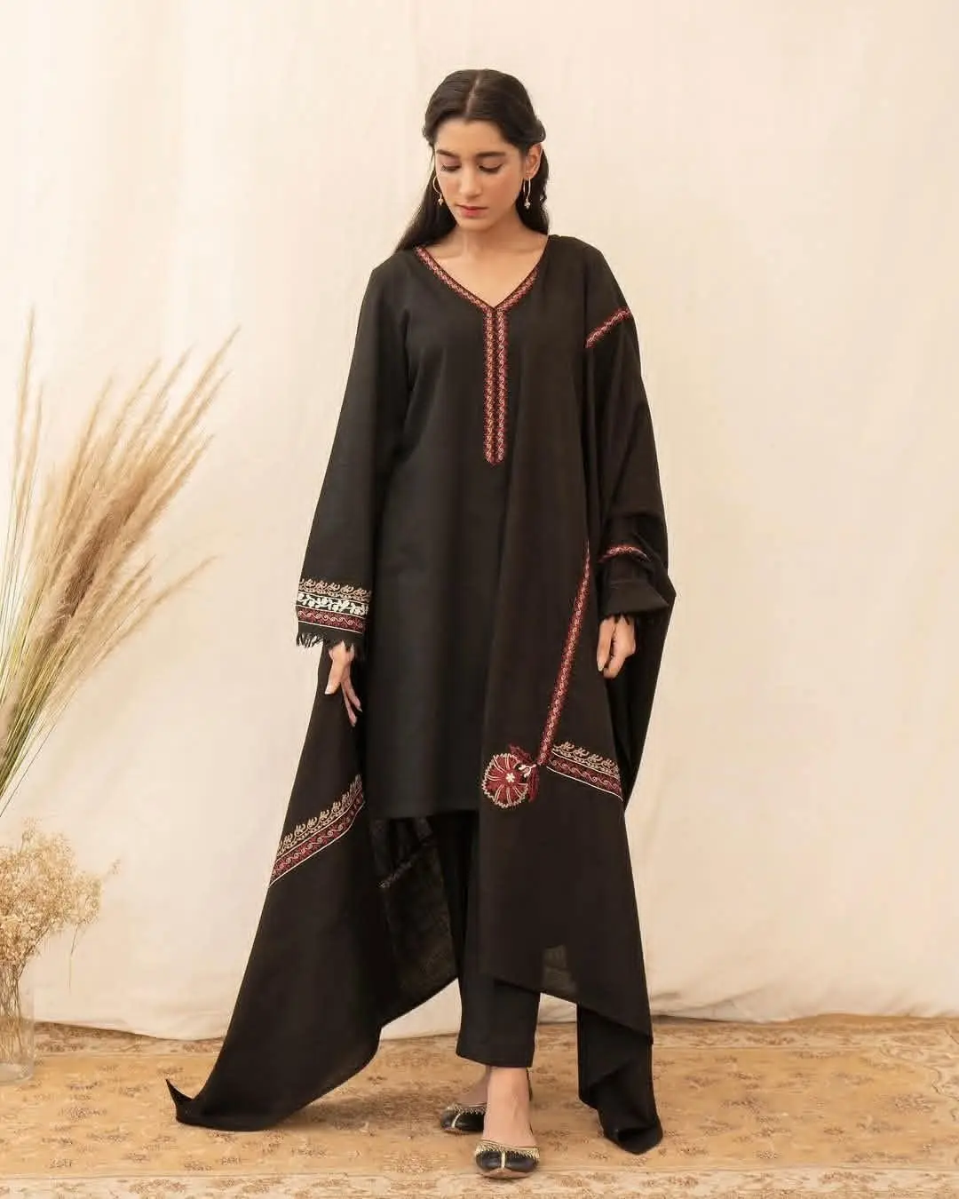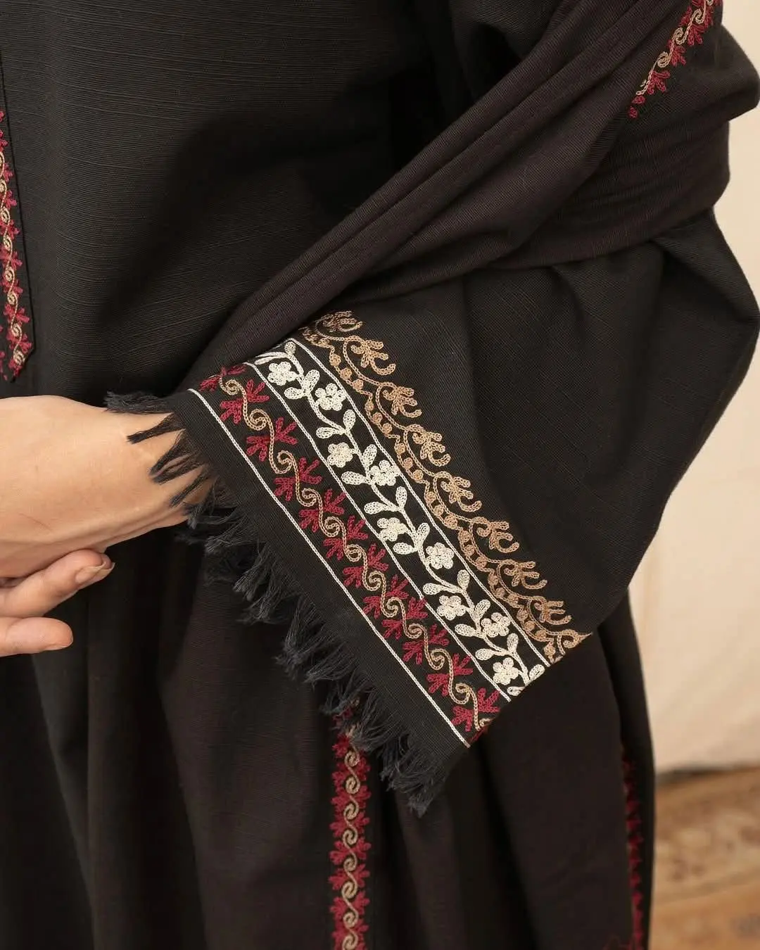 A perfect blend of grace and sophistication β Zarpash β Siyah Nazakat is designed for the woman who values elegance wrapped in tradition. The deep black base is adorned with delicate floral cross-stitch embroidery and subtle tilla work, giving this outfit a timeless and refined look.